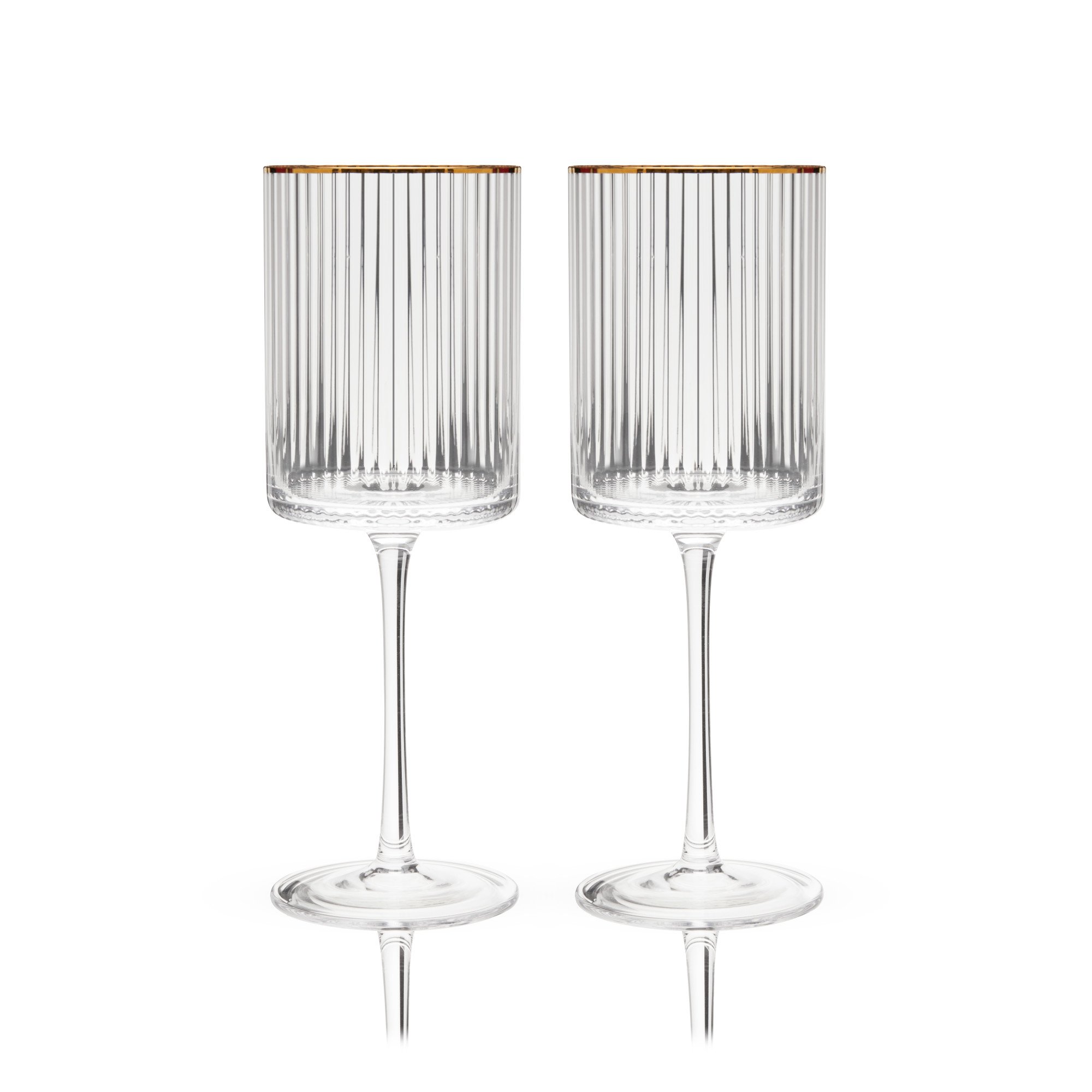 Enjoy red or white wine from these stemmed wine glasses. Crafted from sparkling lead-free crystal, they feature a unique rippled texture and gold-dipped rims inspired by the geometric elegance of Art Deco architecture. Hand wash. 16 oz.