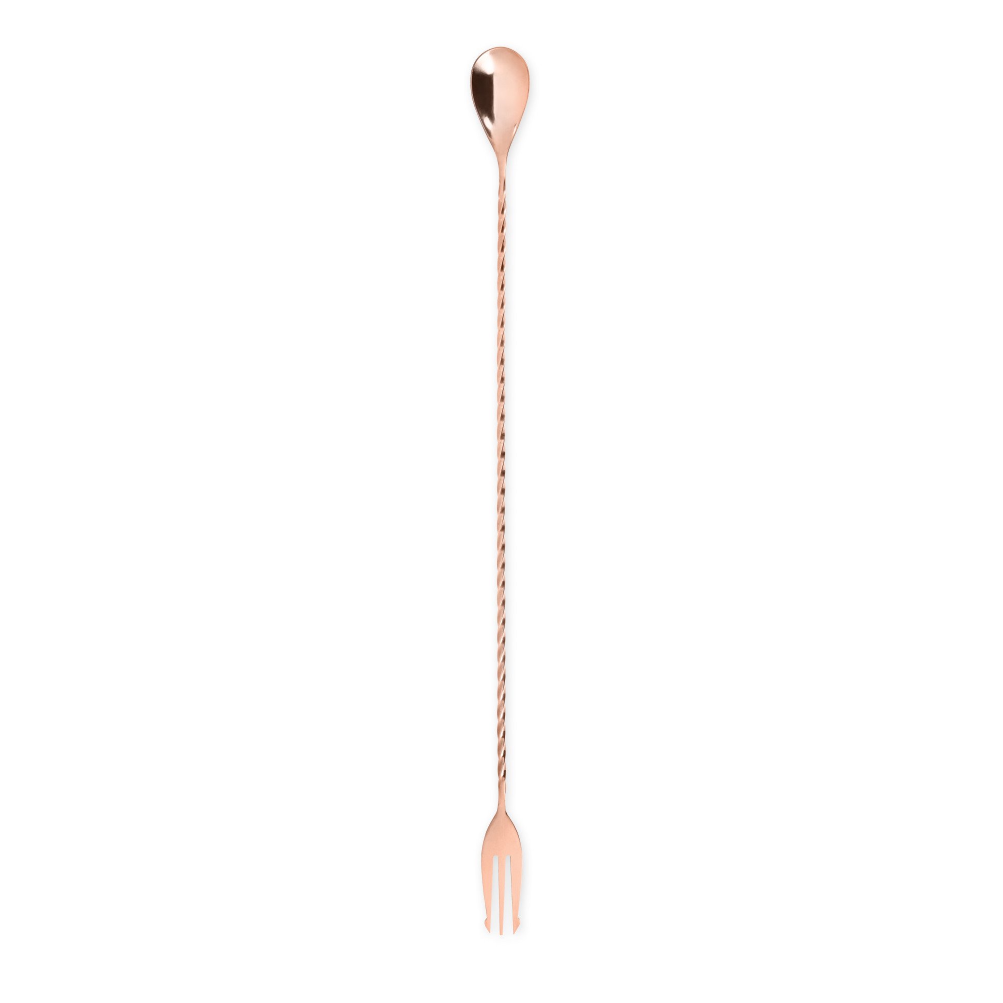 Designed for swizzling and stirring, our copper trident bar spoon sports a smooth spoon bowl and a forked tip at the stem's far end. A nod to the nautical, the trident also works for spearing the perfect garnish to cap your drink. At 15.75″ long and made from stainless steel with a polished copper finish, this spiral bar spoon makes an elevated addition to your home bar tools. It’s perfect for stirring drinks in a mixing glass or in a highball, layering shots, or carefully pouring carbonated beverages while preserving bubbles.