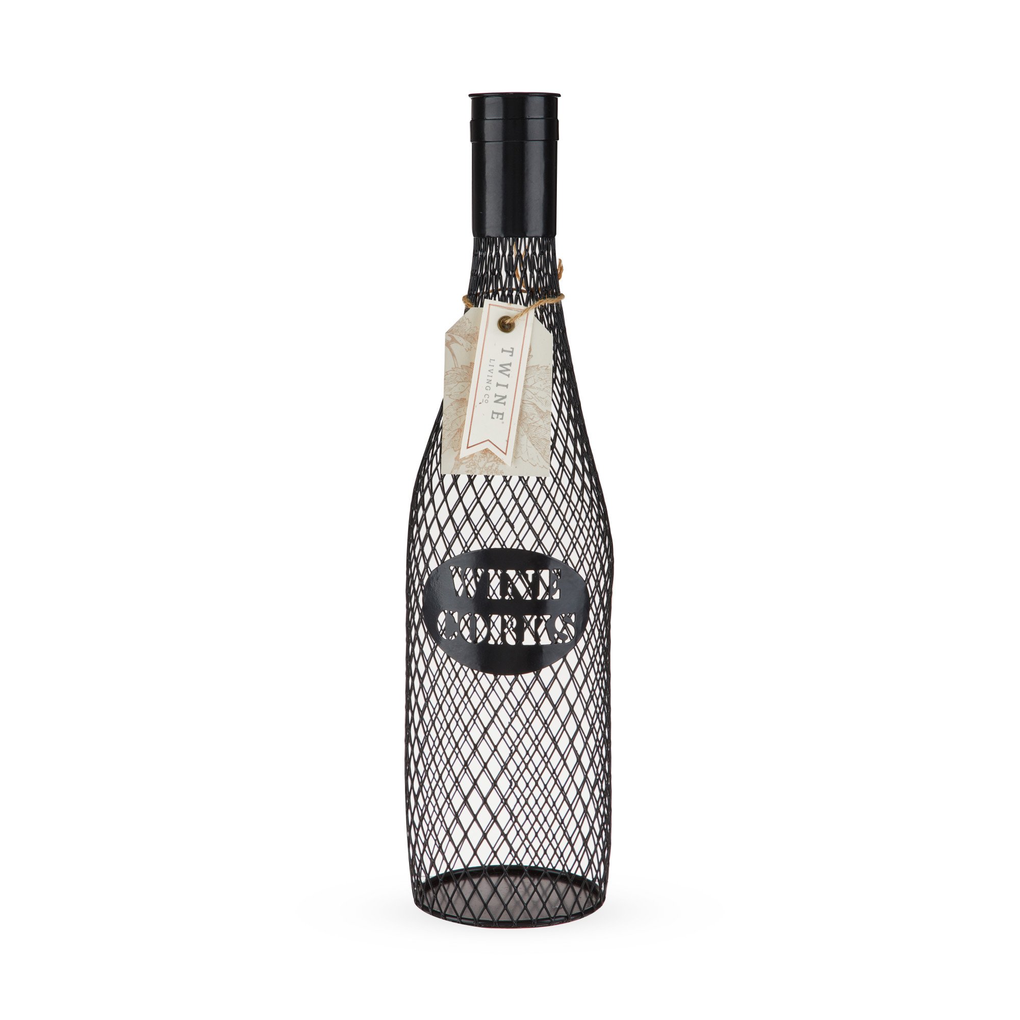 Form and function intertwine to create this metal cork holder. Its quaint wine bottle shape, sleek black finish, and clever label are all sure to charm. Holds up to 60 corks to satisfy even the heartiest wine lovers. Crafted from sturdy metal. Makes a great gift for design-conscious wine lovers. Holds 60 corks, measures 13" H x 3.5" W, cage design.