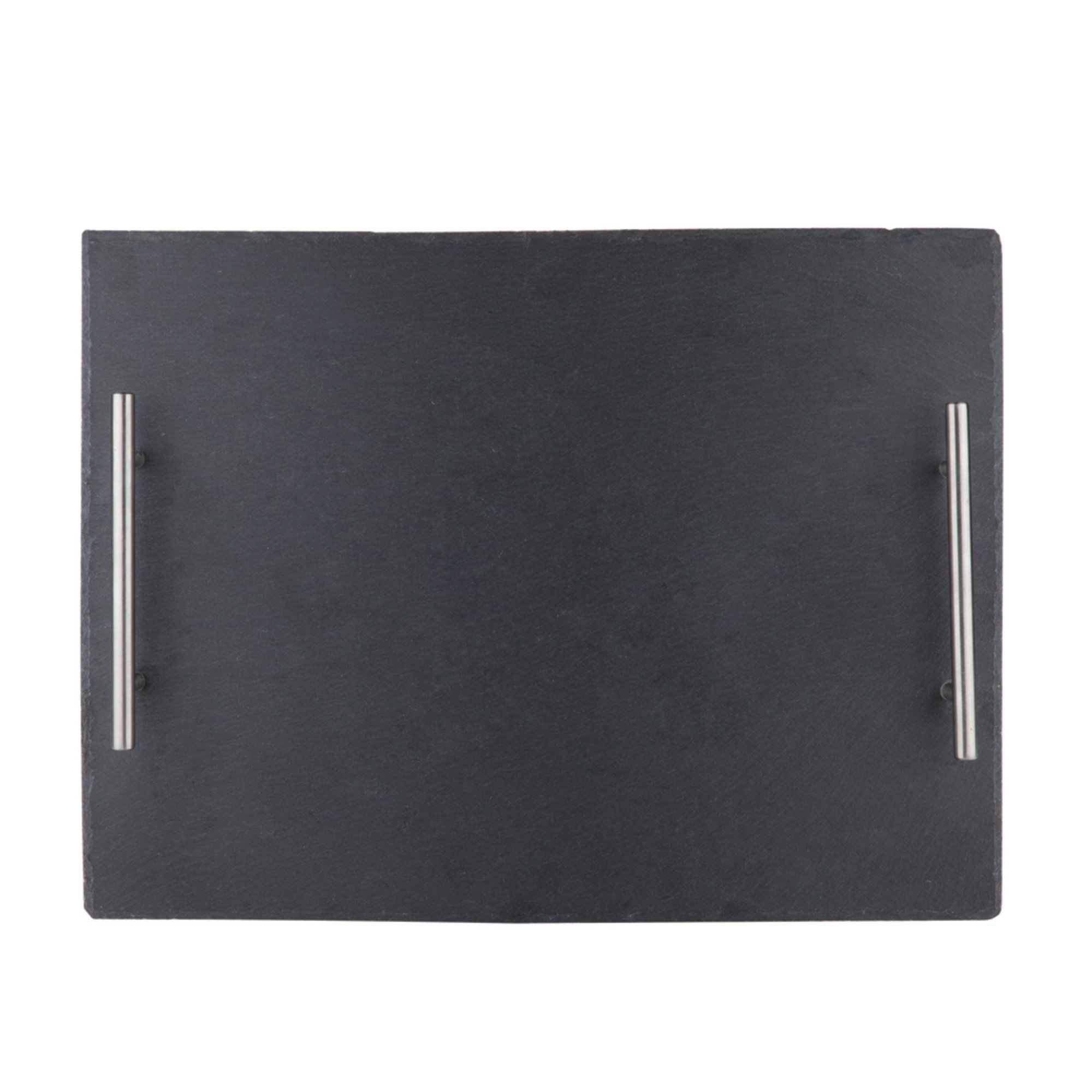 This slate cheese board is an ingenious take on a staple product for your home. Slim, sleek, steel-handled: our rectangular slate cheese and appetizer board puts modern spin on a classic serving piece. Use it for crackers, Camembert, Roquefort or Cheddar, then whisk it away for easy clean-up. Natural slate with stainless steel handles Padded feet Hand wash only 15.75" by 11.75" Non-porous and food-safe True crafts beautiful, functional wares for the modern host. Entertain in style.