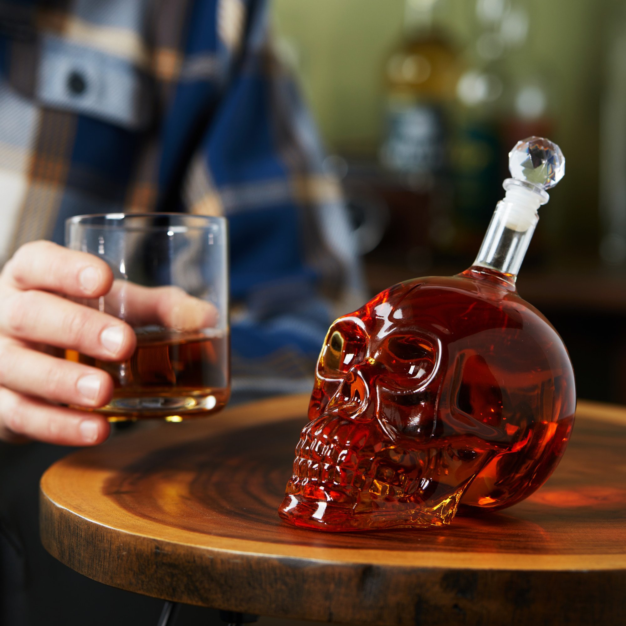 Introducing the Foster & Rye Skull Liquor Decanter, the ultimate conversation starter for your home bar. This glass skull decanter is the coolest way to store your favorite spirits, from bourbon whiskey to vodka, rum, or gin. With its spooky eye sockets and wide grin, this detailed skull decor is sure to impress your guests, making it a standout piece in any liquor bar and a must have man cave accessories. Crafted from clear glass, the decanter features a faceted crystal stopper that adds an extra touch of elegance. It holds 25 oz. (750 ml) of liquor, which is roughly the amount in a standard whiskey bottle or liquor bottles. Whether you want to display your favorite bourbon decanter, or any liquor decanters, this glass whiskey decanter will be a unique addition to your collection. Perfect for those who appreciate fine whiskey accessories, this whiskey decanter for men is an accent piece for the whiskey bar in your home. Enhance your bar accessories for the home and add a dash of personality to your drinking accessories with this whiskey glass decanter. Whether you're a fan of scotch decanter or cognac decanter, this versatile piece is sure to elevate your spirits.