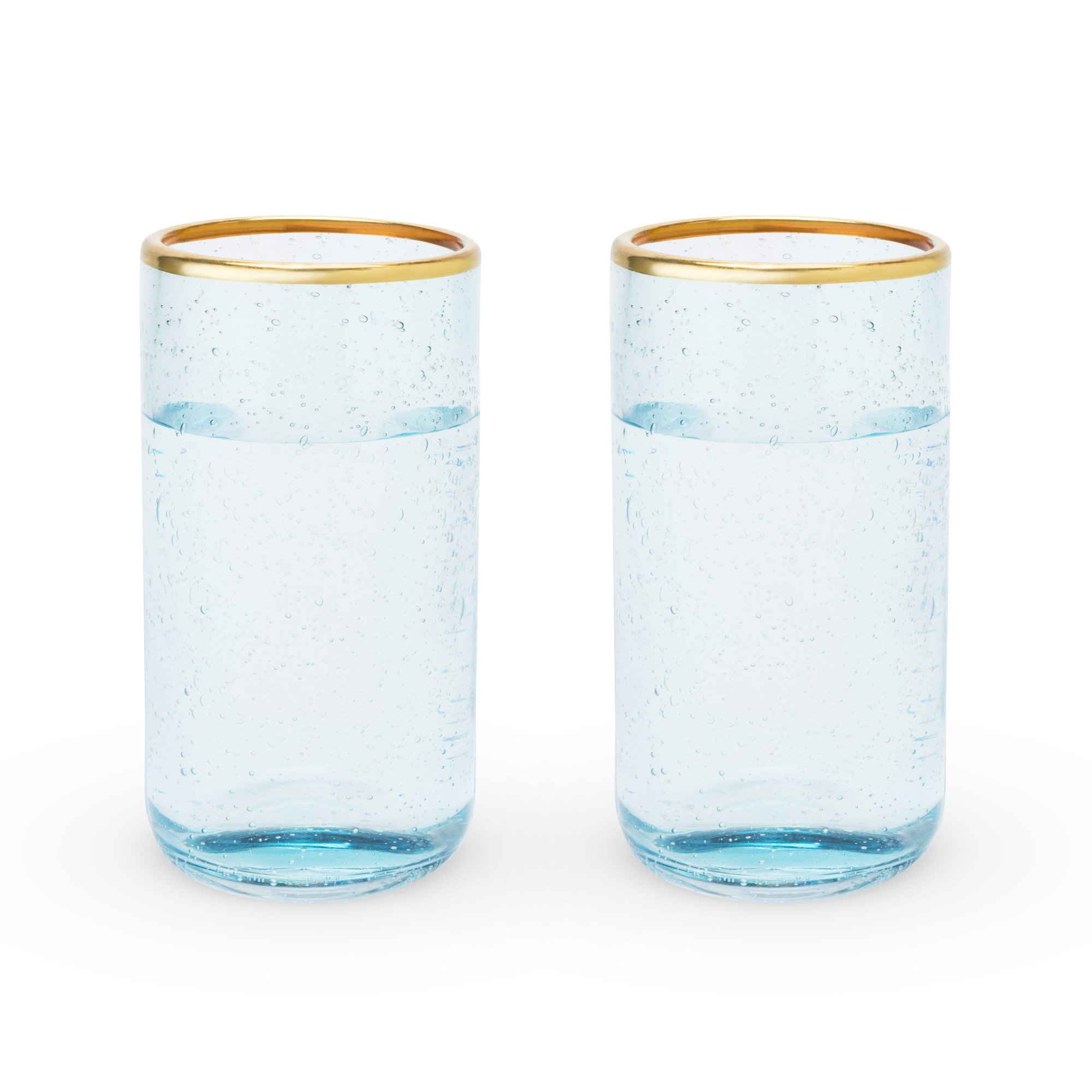A series of delicate bubbles sit suspended in aqua-tinted glass while a laurel of gleaming gold plating adorns the rim, adding a vestige of intrigue to an already stunning set of glassware. Designed to contain 16 ounces comfortably, each tumbler is impeccably suited to accommodate any of your favorite mixed beverages. Set of 2 Holds 16 ounces each Bubbled glass detail Electroplated gold rim Makes a great gift Hand wash recommended Twine crafts glassware and home goods with an emphasis on classic style, natural materials, and a nostalgic sense of quality. From elegant glassware to charming bar tools, Twine ties everything together.