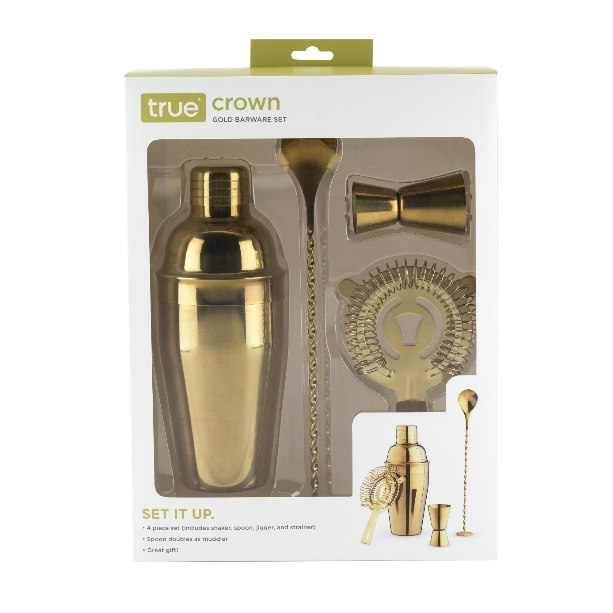 Introducing the True Gold Barware Set, the ultimate cocktail making kit for your home bar or bar cart! This vibrant cocktail kit set is the perfect addition to elevate your cocktail crafting game. This 4 piece set includes a stainless steel shaker, spoon, jigger, and a Hawthorne strainer - all the barware basics you need for mixology magic. The spoon doubles as a muddler, making this cocktail mixer set a versatile asset for your barware collection. The True Gold Barware Set is much more than a simple cocktail shaker kit. It comes with a cocktail shaker with strainer, making it an all-in-one drink shaker set. The Hawthorne strainer is the ideal shape for quickly and efficiently serving drinks, making it the ultimate addition to your bar tool set. Craft the best margarita, daiquiri, cosmopolitan, mai tai, and other iconic cocktails with this bartender kit. The metallic finish on the durable stainless steel base of the cocktail shaker set bartender kit adds a touch of elegance to your bar sets. The alcohol shaker bottle, martini kit, and other elements of this bar cocktail set make it a must-have for any cocktail enthusiast.
