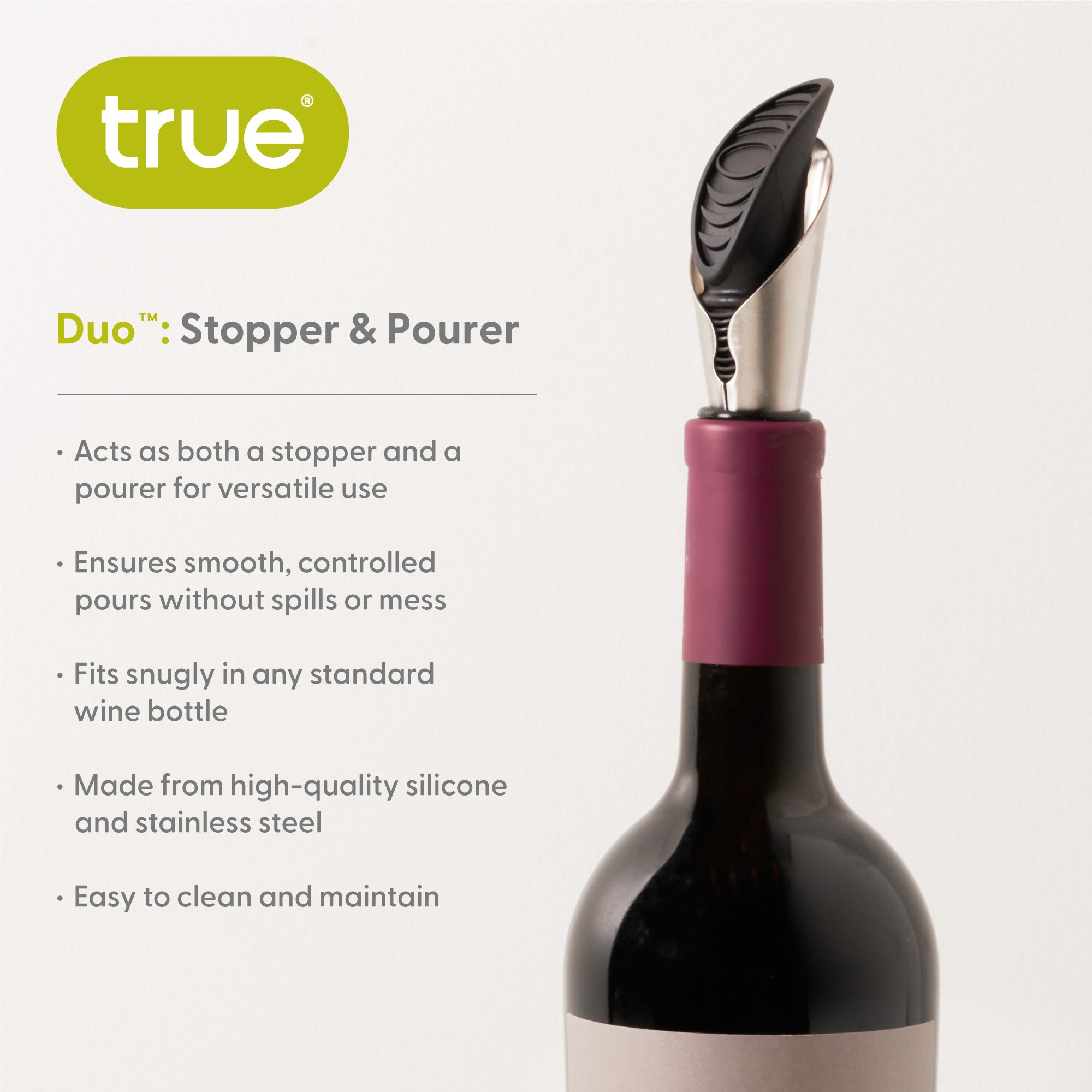 Use the Duo™ Stopper & Pourer separately to pour drip-free from one bottle as you preserve another. Or combine both to keep one wine plugged between pours. Each piece fits securely in any standard bottle, making them versatile together or separate.
