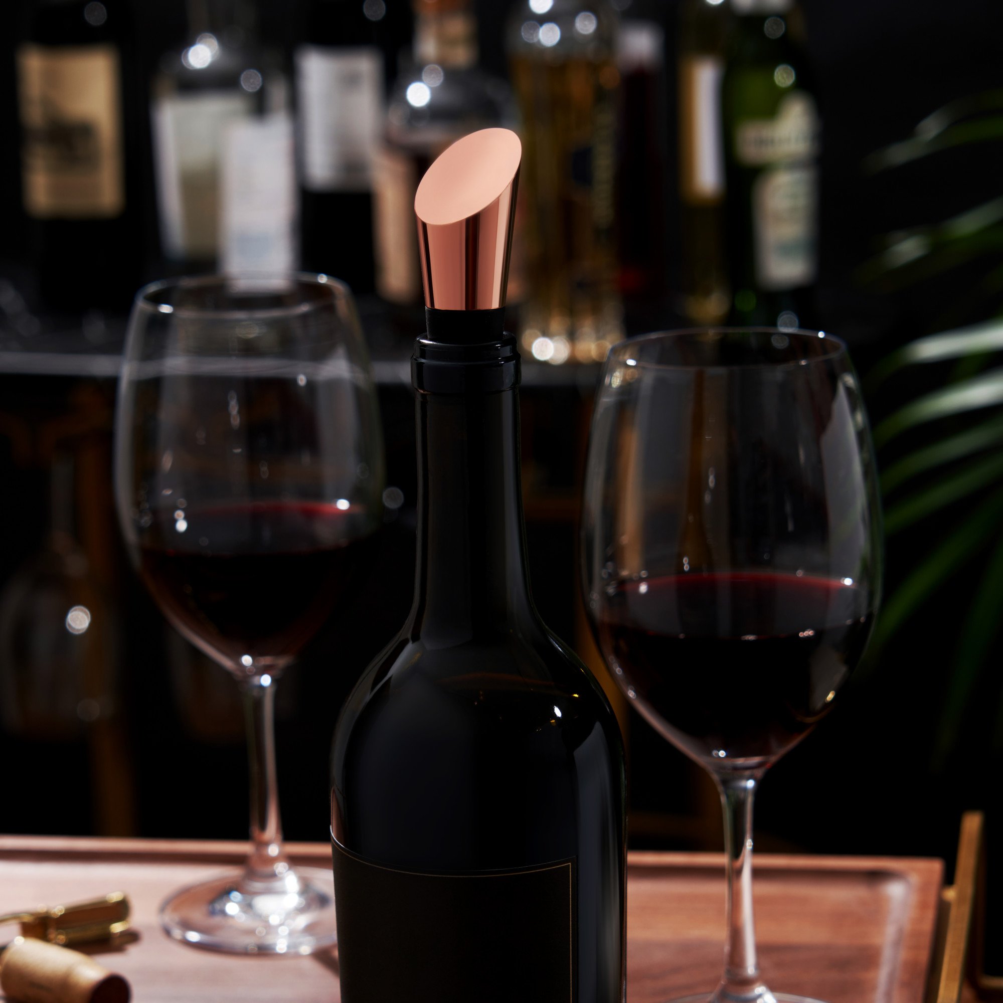 Eye-catching copper with a smooth silicone sleeve puts our heavyweight bottle stopper in center stage. Seemingly austere in shape, the slanted crown and burnished metal suggest an opulence that transcends the average tavern contrivance.