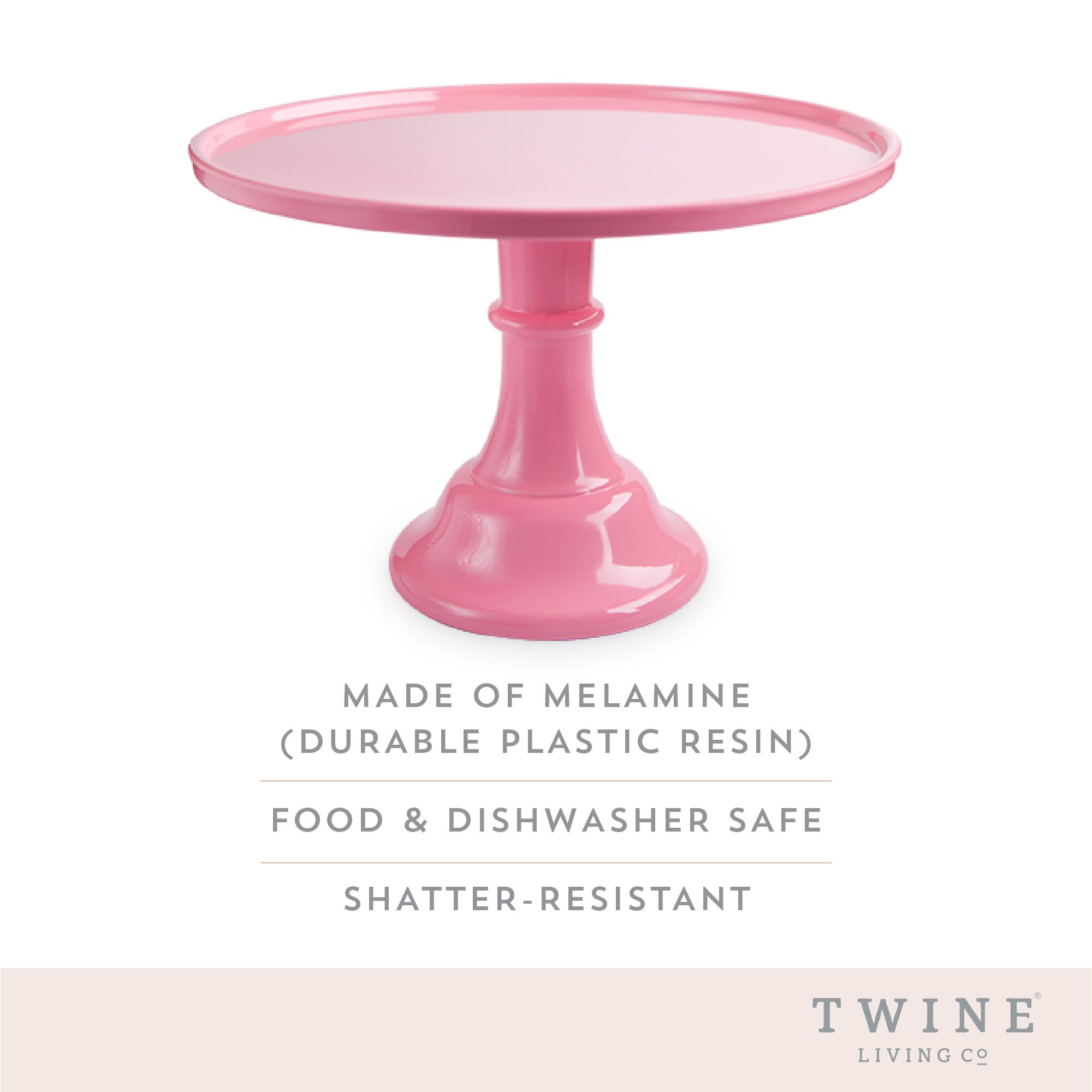 Welcome to the world of Twine where style meets functionality! Get ready to be mesmerized by our Pink Melamine Cake Stand, the perfect home decor piece that doubles as a party essential. This versatile cupcake display stand can effortlessly transform your tablescape, be it for a baby shower, birthday party, or a wedding shower. Crafted from high-grade melamine, this cake stand pink is not just about the looks. It provides hardness, strength, and water resistance, ensuring your desserts stay in place, come rain or shine, indoors or outdoors. Moderately heat resistant, it serves as a great stage for your hot out-of-the-oven cupcakes and muffins. Use it as a cupcake tray, a fruit display, or a dessert stand. The possibilities are endless with this versatile piece that doubles as kitchen decor and party tray. Measuring 11.5 inches in diameter and 8 inches tall, this round cake stand easily fits on tables as a cake centerpiece, or at buffet serving tables. It's the perfect size for a wedding cake stand or a birthday cake display. Just attach the cake stand base to the cake plate using the included screws. And voila! Your cake display is ready to steal the show.