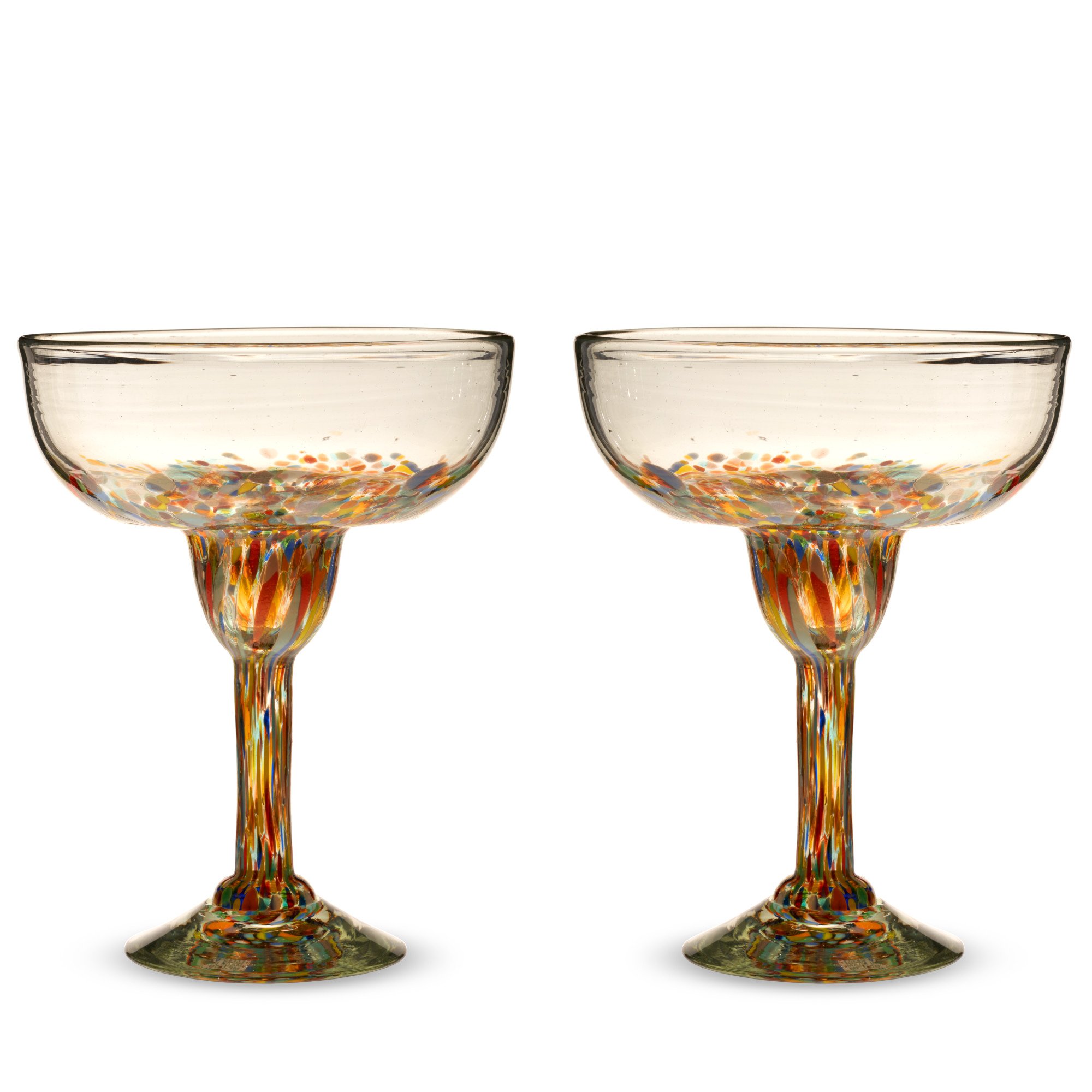 A riot of color makes these dazzling stemmed Margarita glasses stand out. Handblown by Mexican artisans from recycled glass, this speckled cocktail glassware makes drinks shine. Set of 2 10 oz. cocktail glasses. Hand wash recommended.