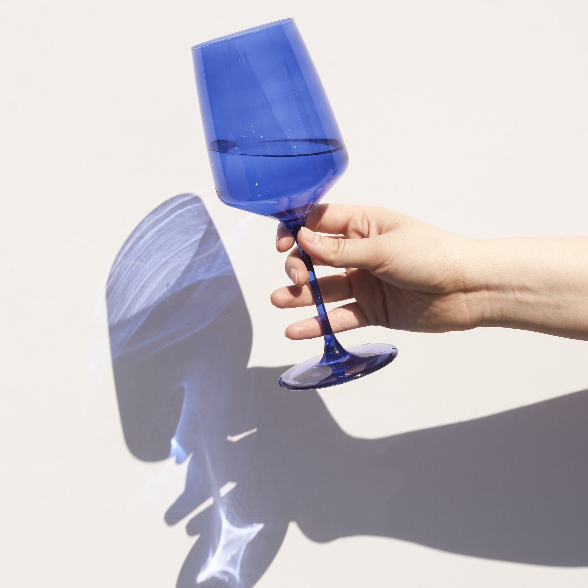 Enjoy your wine in gorgeous blue wine glasses. Crafted from European crystal, these stemmed wine glasses have a modern, angled silhouette with elegant stems and a striking ultramarine hue. Set of 2 wine glasses. European lead-free crystal. 22 oz. capacity. Hand wash recommended.