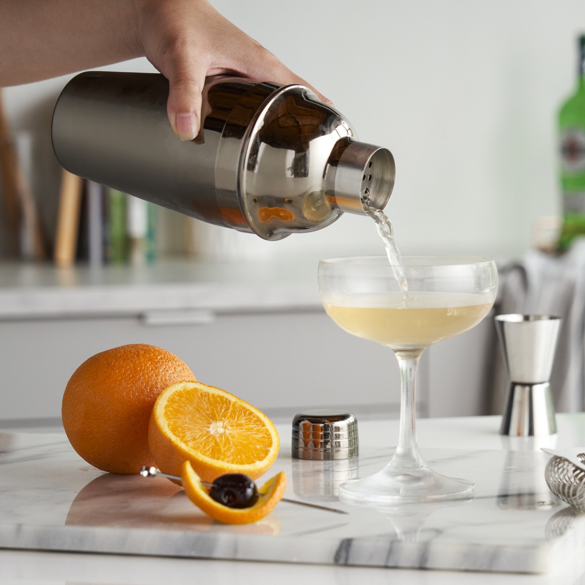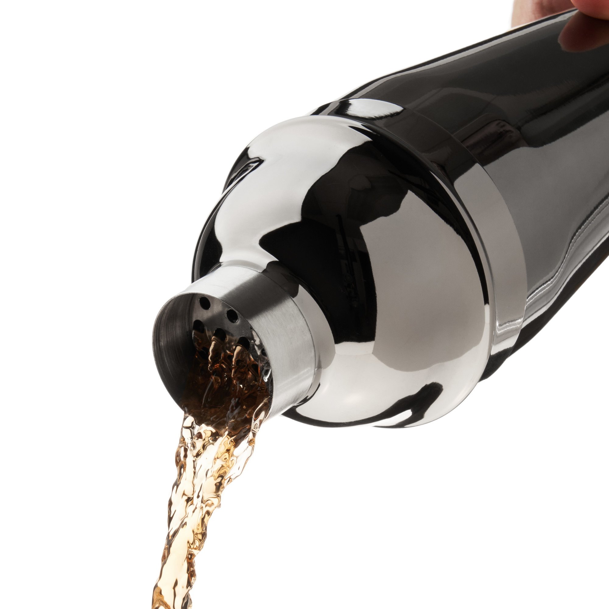 The stainless steel curves and gunmetal finish of this 18-ounce cocktail shaker fit effortlessly into your palm while standing out on any bar. With a tight-fitting cap and built-in strainer, it allows you to shake and pour with effortless professionalism. Perfect for seasoned bartenders or anyone who wants to feel like one.