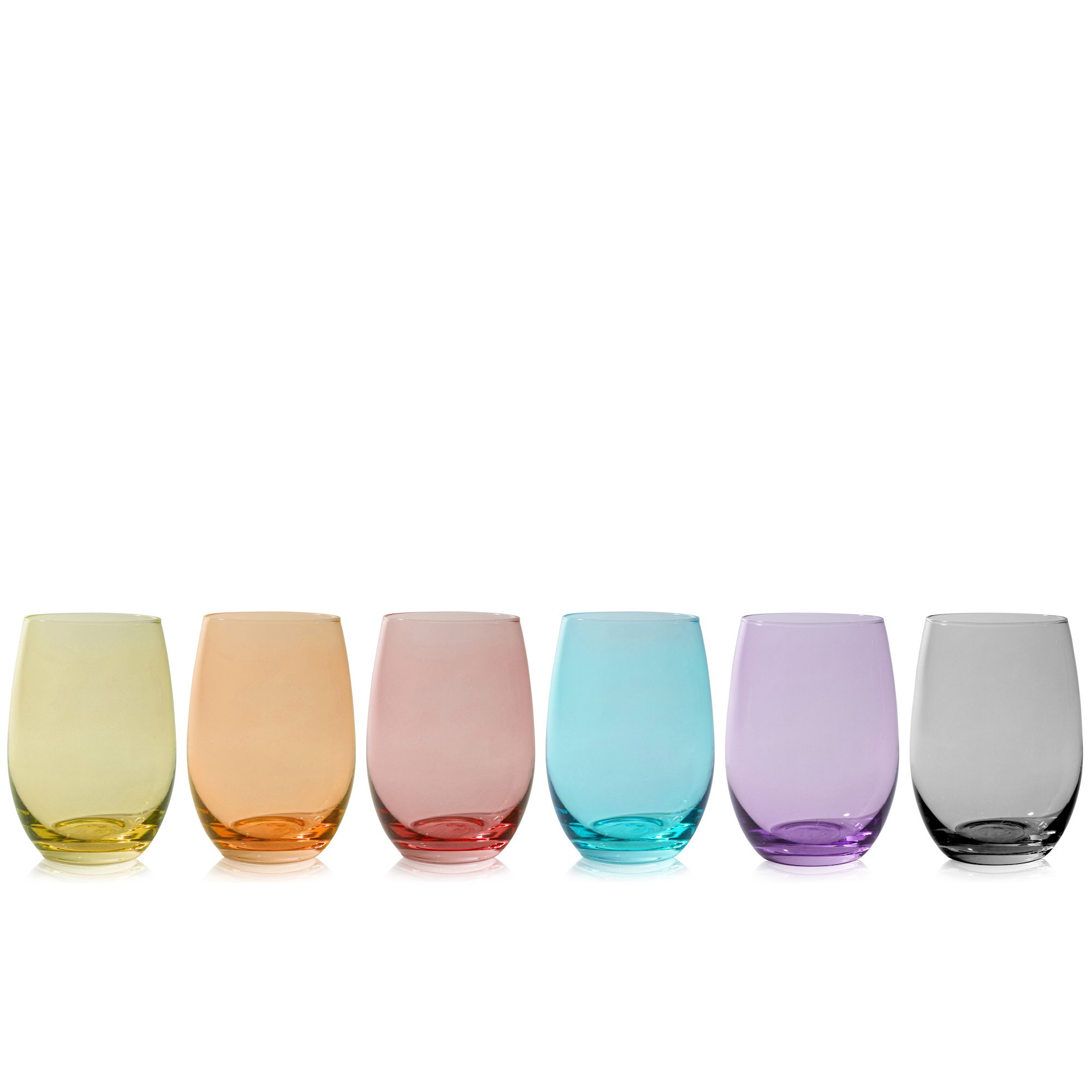 Add a vibrant touch to glassware with this set of 6 colorful stemless wine glasses. Perfect for wine, cocktails, or any beverage, each glass holds 17 ounces and showcases modern, stemless design in stunning hues: orange, smoke, pink, yellow, purple, and blue. These versatile glasses combine functionality with a pop of color, making them ideal for entertaining or daily use. Crafted from durable colorful glass, they are perfect for brightening up your table setting while being easy to hand wash and reuse.