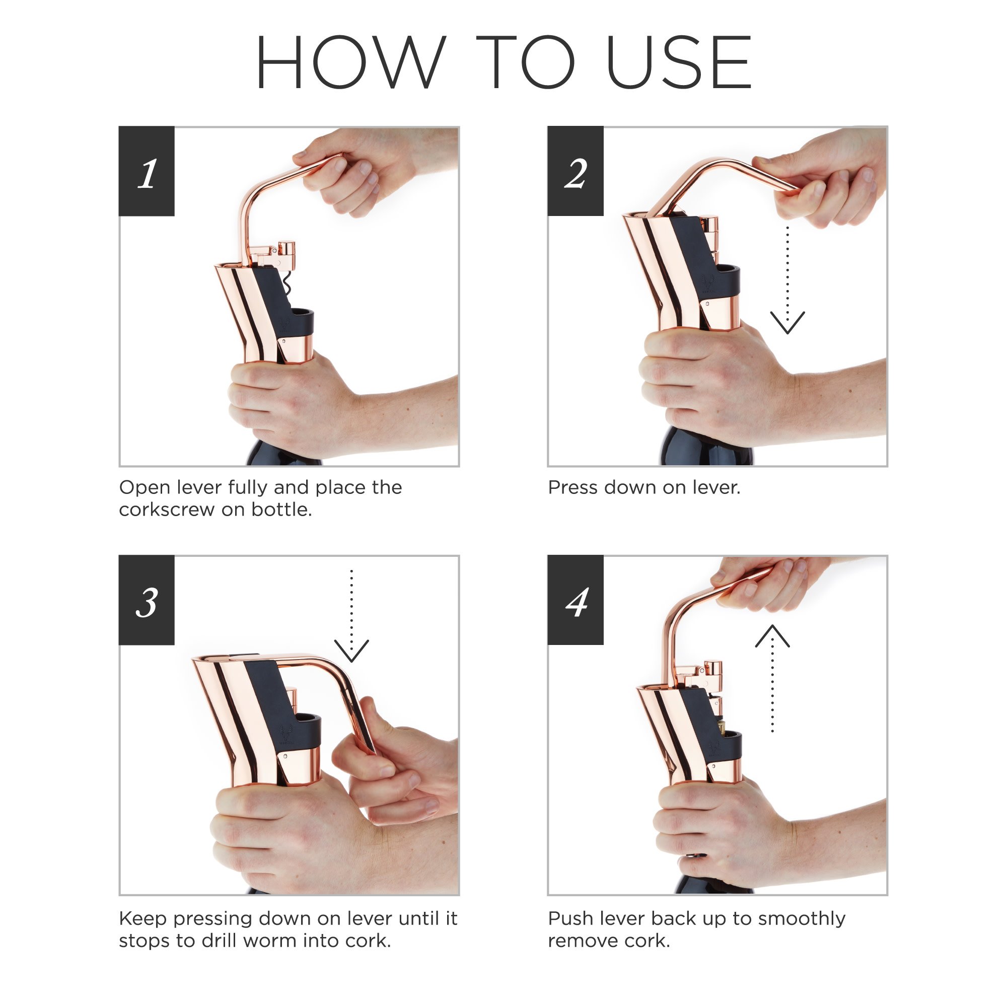 Leaving a lasting impression, this state-of-the-art lever corkscrew marries function and aesthetic for the ultimate home-bar accessory. Uncork bottles with one smooth motion; one pump of the handle and you're ready to pour. 5-turn, non-stick worm Gunmetal black finish One motion wine bottle opener Ergonomic handle A fantastic gift – This wine opener is the ideal gift for any wine enthusiast who is partial to a glass (or three). Along with a bottle of their favorite wine, gift this wine accessory gift to that special person in your life.